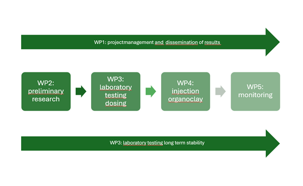Surface-modified clay has the ability to adsorb PFAS and thus remove them from water. Surface-modified-clay is already used for water treatment and for mixing with soil to reduce PFAS leaching. It has a large adsorption capacity and can also adsorb short-chain PFAS. Moreover, it retains its adsorption properties even at high pH values. However, it is not always practical to mix organoclay with soil. For deeper and hard-to-reach contamination, injection of this clay is a possibility to immobilize PFAS in soil. By adsorbing PFAS to surface-modified, the migration of PFAS into groundwater will be reduced. However, there is currently no experience with injection of this material into soil. This project will investigate whether surface-modified clay can be injected using Injectis’ innovative SPIN® injection technology at 2 sites with different lithology and contamination characteristics. This injection method allows injection substances to be injected homogeneously over a depth interval with different soil layers. In addition, lab tests, batch and column tests, will be performed by VITO to verify the effectiveness and durability of PFAS immobilization in both the short and long term under different stressing conditions. This project will allow to determine under which conditions organoclay can be applied for in situ stabilization of PFAS contamination.